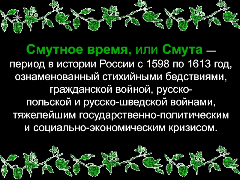 Слайд 2Смутное время, или Смута — период в истории России с 1598 по 1613 год, ознаменованный стихийными бедствиями, гражданской войной, русско-польской и русско-шведской войнами, тяжелейшим государственно-политическим