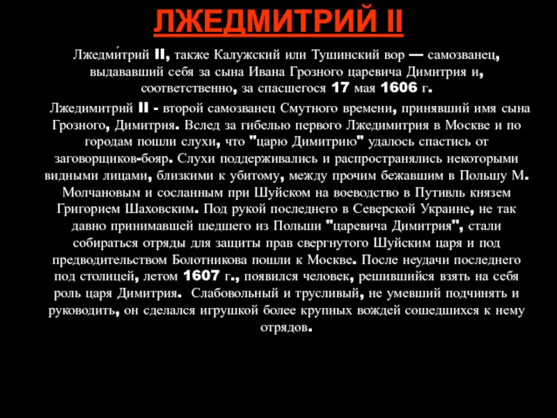 Лжедимитрий II - второй самозванец Смутного времени, принявший имя сына Грозного, Димитрия. Вслед за гибелью первого Лжедимитрия в Москве и по городам пошли слухи, что "царю Димитрию" удалось спастись от заговорщиков-бояр. Слухи поддерживались и распространялись некоторыми видными лицами, близкими к убитому, между прочим бежавшим в Польшу М. Молчановым и сосланным при Шуйском на воеводство в Путивль князем Григорием Шаховским. Под рукой последнего в Северской Украине, не так давно принимавшей шедшего из Польши "царевича Димитрия", стали собираться отряды для защиты прав свергнутого Шуйским царя и под предводительством Болотникова пошли к Москве. После неудачи последнего под столицей, летом 1607 г., появился человек, решившийся взять на себя роль царя Димитрия. Слабовольный и трусливый, не умевший подчинять и руководить, он сделался игрушкой более крупных вождей сошедшихся к нему отрядов.