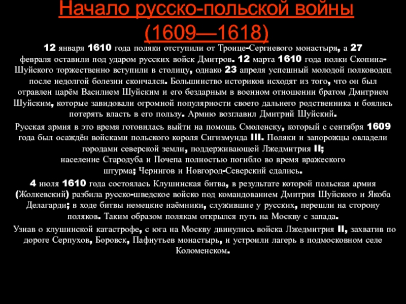 русских войск Дмитров. 12 марта 1610 года полки Скопина-Шуйского торжественно вступили в столицу, однако 23 апреля успешный молодой полководец после недолгой болезни скончался. Большинство историков исходят из того, что он был отравлен царём Василием Шуйским и его бездарным в военном отношении братом Дмитрием Шуйским, которые завидовали огромной популярности своего дальнего родственника и боялись потерять власть в его пользу. Армию возглавил Дмитрий Шуйский.