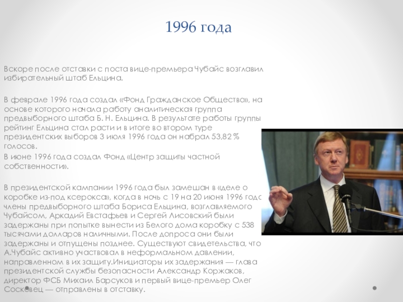 Участие в предвыборной кампании Ельцина 1996 годаВскоре после отставки с поста вице-премьера Чубайс возглавил избирательный штаб Ельцина.В