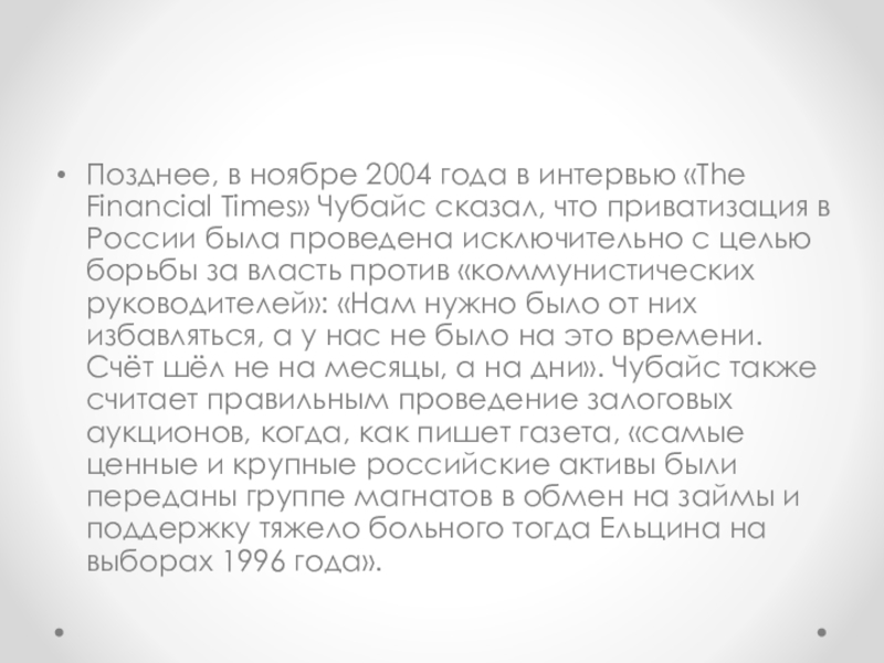 Слайд 5Позднее, в ноябре 2004 года в интервью «The Financial Times» Чубайс