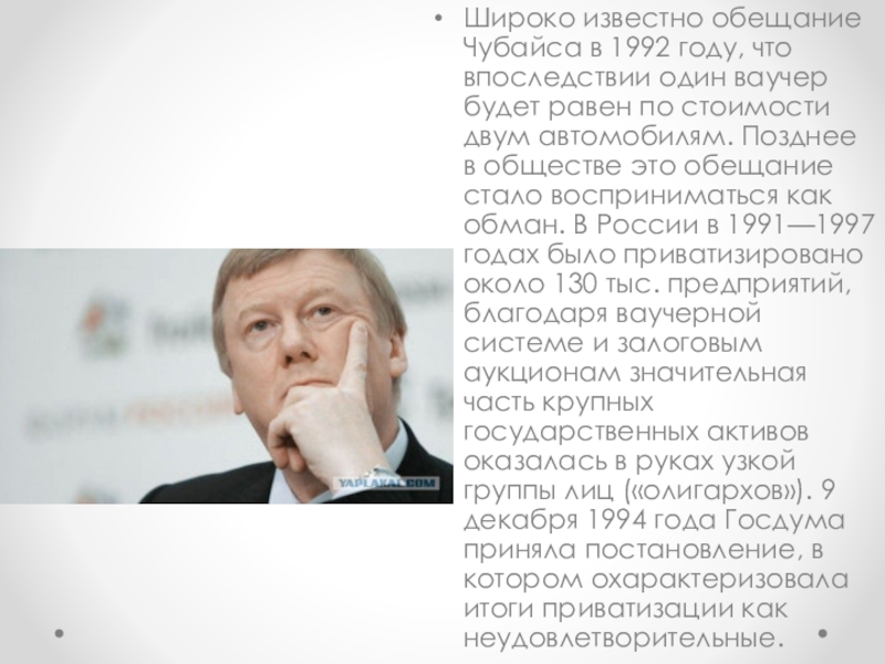 будет равен по стоимости двум автомобилям. Позднее в обществе это обещание стало восприниматься как обман. В России в 1991—1997 годах было приватизировано около 130 тыс. предприятий, благодаря ваучерной системе и залоговым аукционам значительная часть крупных государственных активов оказалась в руках узкой группы лиц («олигархов»). 9 декабря 1994 года Госдума приняла постановление, в котором охарактеризовала итоги приватизации как неудовлетворительные.