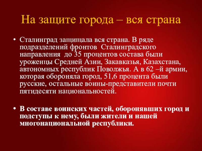 подразделений фронтов Сталинградского направления до 35 процентов состава были уроженцы Средней Азии, Закавказья, Казахстана, автономных республик Поволжья. А в 62 –й армии, которая обороняла город, 51,6 процента были русские, остальные воины-представители почти пятидесяти национальностей.