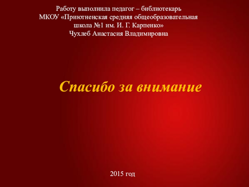 Слайд 23Работу выполнила педагог – библиотекарь