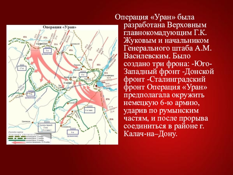 А.М. Василевским. Было создано три фрона: -Юго-Западный фронт -Донской фронт -Сталинградский фронт Операция «Уран» предполагала окружить немецкую 6-ю армию, ударив по румынским частям, и после прорыва соединиться в районе г. Калач-на–Дону.