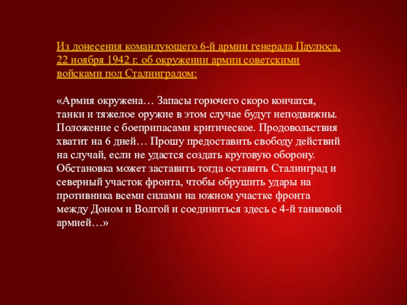 «Армия окружена… Запасы горючего скоро кончатся, танки и тяжелое оружие в этом случае будут неподвижны. Положение с боеприпасами критическое. Продовольствия хватит на 6 дней… Прошу предоставить свободу действий на случай, если не удастся создать круговую оборону. Обстановка может заставить тогда оставить Сталинград и северный участок фронта, чтобы обрушить удары на противника всеми силами на южном участке фронта между Доном и Волгой и соединиться здесь с 4-й танковой армией…»