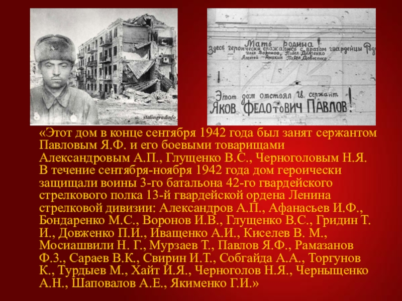 Я.Ф. и его боевыми товарищами Александровым А.П., Глущенко В.С., Черноголовым Н.Я. В течение сентября-ноября 1942 года дом героически защищали воины 3-го батальона 42-го гвардейского стрелкового полка 13-й гвардейской ордена Ленина стрелковой дивизии: Александров А.П., Афанасьев И.Ф., Бондаренко М.С., Воронов И.В., Глущенко В.С., Гридин Т.И., Довженко П.И., Иващенко А.И., Киселев В. М., Мосиашвили Н. Г., Мурзаев Т., Павлов Я.Ф., Рамазанов Ф.3., Сараев В.К., Свирин И.Т., Собгайда А.А., Торгунов К., Турдыев М., Хайт И.Я., Черноголов Н.Я., Черныщенко А.Н., Шаповалов А.Е., Якименко Г.И.»