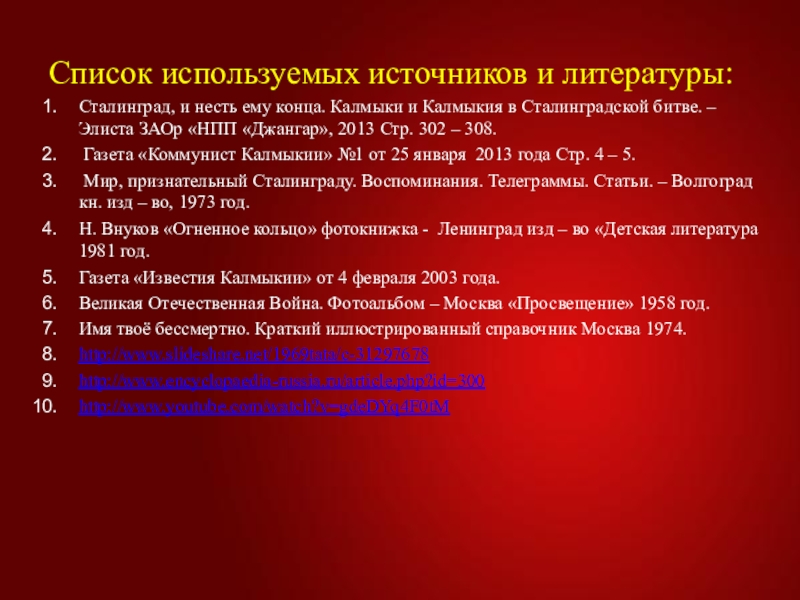 Калмыкия в Сталинградской битве. – Элиста ЗАОр «НПП «Джангар», 2013 Стр. 302 – 308.