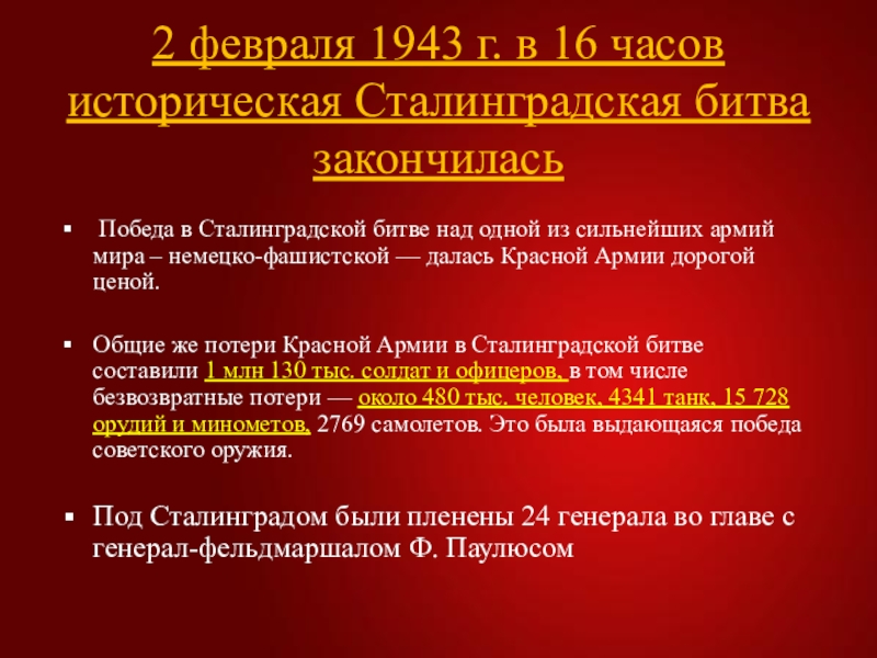 Слайд 202 февраля 1943 г. в 16 часов историческая Сталинградская битва закончилась