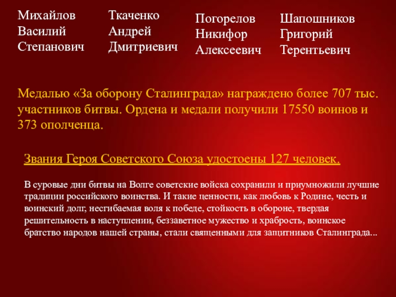 В суровые дни битвы на Волге советские войска сохранили и приумножили лучшие традиции российского воинства. И такие ценности, как любовь к Родине, честь и воинский долг, несгибаемая воля к победе, стойкость в обороне, твердая решительность в наступлении, беззаветное мужество и храбрость, воинское братство народов нашей страны, стали священными для защитников Сталинграда...