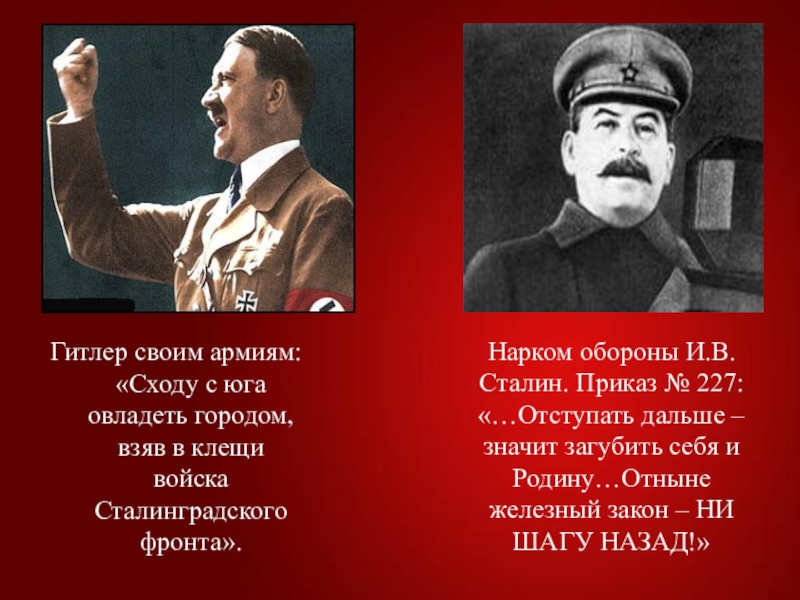 Слайд 7Нарком обороны И.В.Сталин. Приказ № 227: «…Отступать дальше – значит загубить