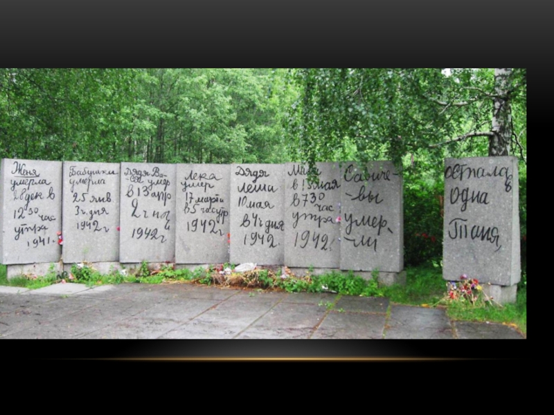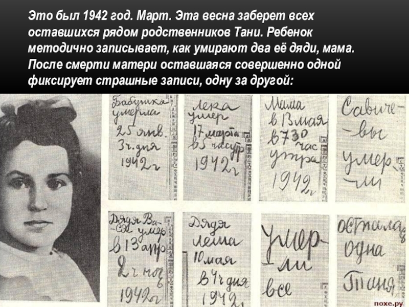 родственников Тани. Ребенок методично записывает, как умирают два её дяди, мама. После смерти матери оставшаяся совершенно одной фиксирует страшные записи, одну за другой: