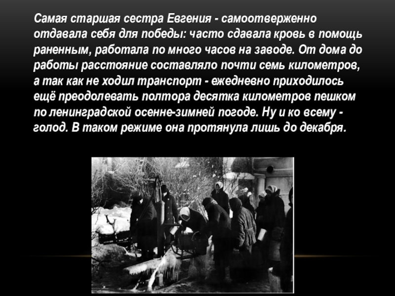 Слайд 6Самая старшая сестра Евгения - самоотверженно отдавала себя для победы: часто