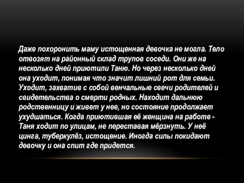 склад трупов соседи. Они же на несколько дней приютили Таню. Но через несколько дней она уходит, понимая что значит лишний рот для семьи. Уходит, захватив с собой венчальные свечи родителей и свидетельства о смерти родных. Находит дальнюю родственницу и живет у нее, но состояние продолжает ухудшаться. Когда приютившая её женщина на работе - Таня ходит по улицам, не переставая мёрзнуть. У неё цинга, туберкулёз, истощение. Иногда силы покидают девочку и она спит где придется.