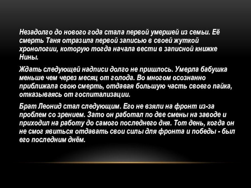 Слайд 7Незадолго до нового года стала первой умершей из семьи. Её смерть