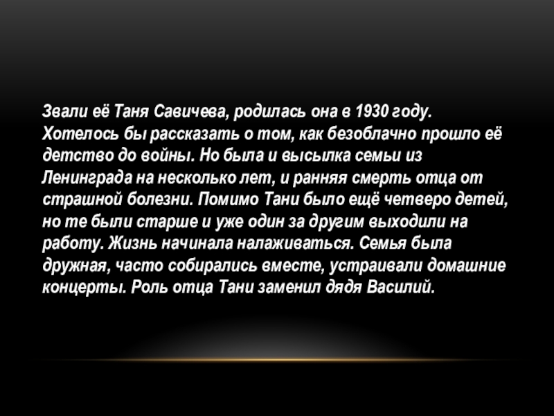 рассказать о том, как безоблачно прошло её детство до войны. Но была и высылка семьи из Ленинграда на несколько лет, и ранняя смерть отца от страшной болезни. Помимо Тани было ещё четверо детей, но те были старше и уже один за другим выходили на работу. Жизнь начинала налаживаться. Семья была дружная, часто собирались вместе, устраивали домашние концерты. Роль отца Тани заменил дядя Василий.