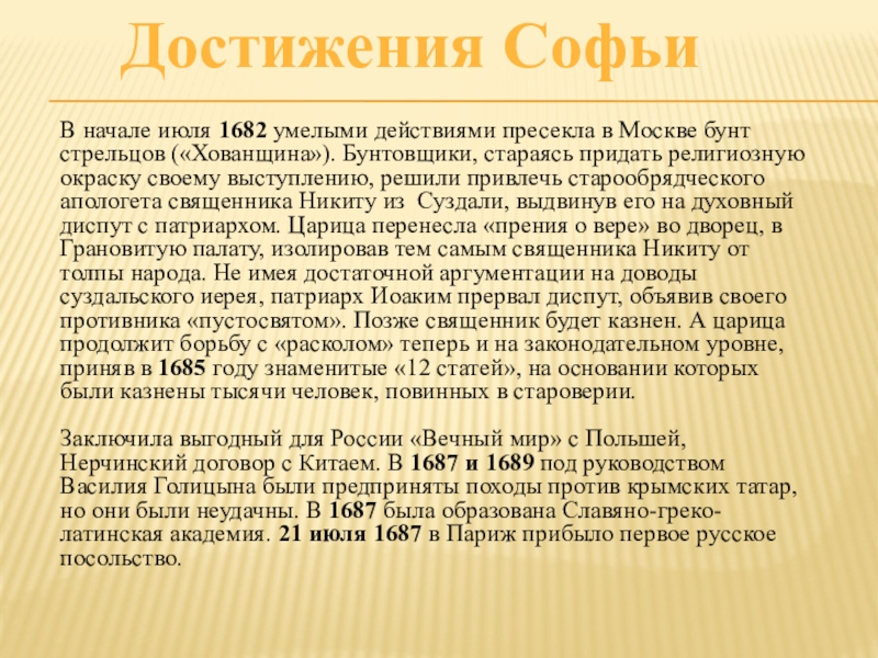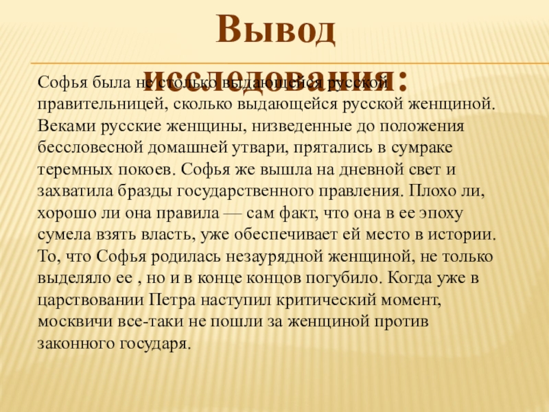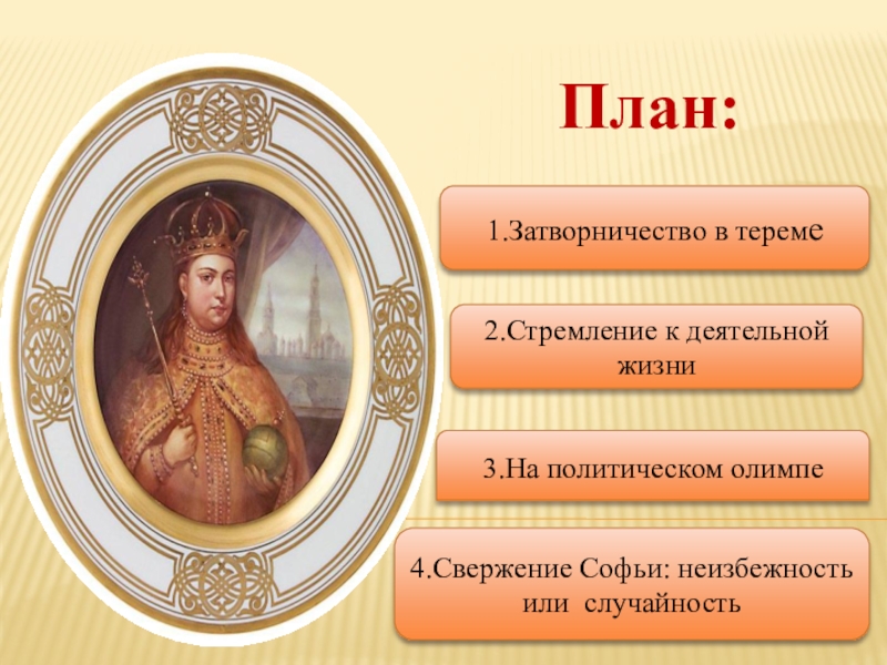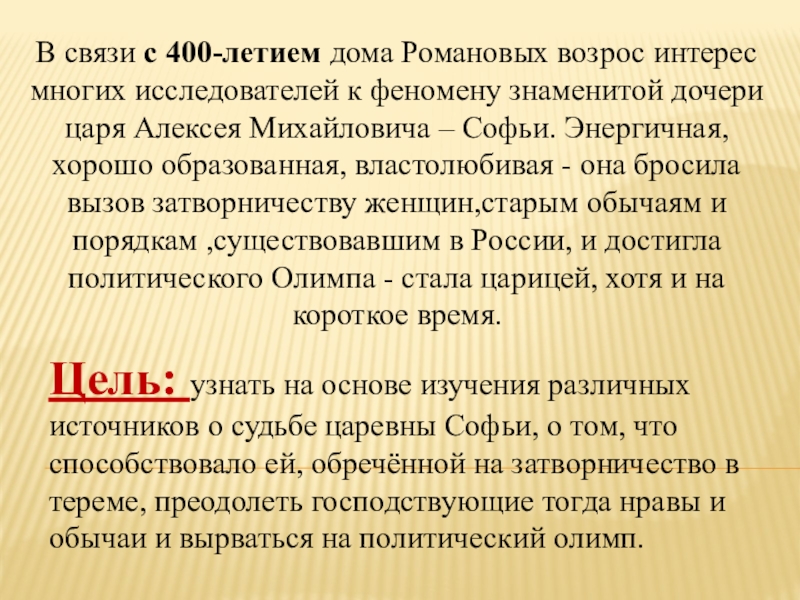 Цель: узнать на основе изучения различных источников о судьбе царевны Софьи, о том, что способствовало ей, обречённой на затворничество в тереме, преодолеть господствующие тогда нравы и обычаи и вырваться на политический олимп.