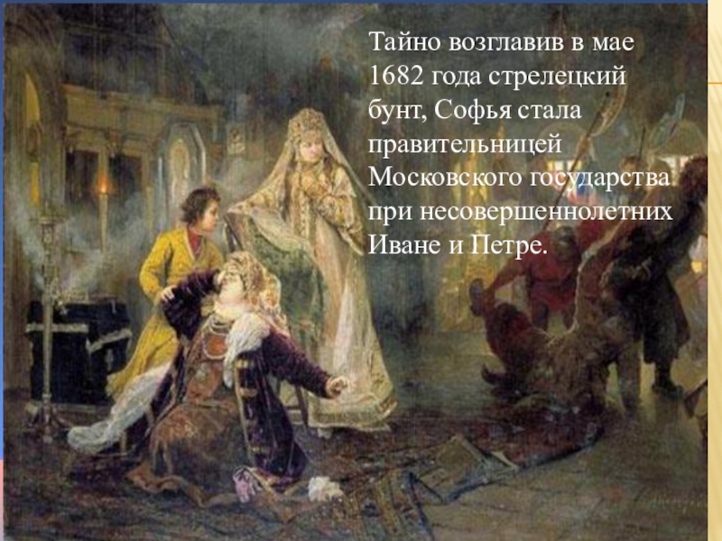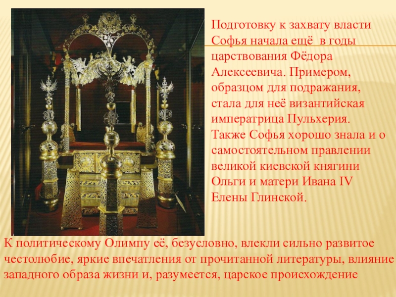 Подготовку к захвату власти Софья начала ещё в годы царствования Фёдора Алексеевича. Примером, образцом для подражания, стала для неё византийская императрица Пульхерия.