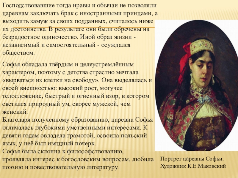 Господствовавшие тогда нравы и обычаи не позволяли царевнам заключать брак с иностранными принцами, а выходить замуж за своих подданных, считалось ниже их достоинства. В результате они были обречены на безрадостное одиночество. Иной образ жизни - независимый и самостоятельный - осуждался обществом.