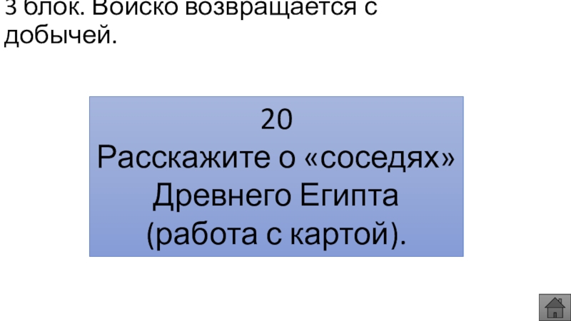 3 блок. Войско возвращается с добычей. 20Расскажите о «соседях» Древнего Египта (работа с картой).