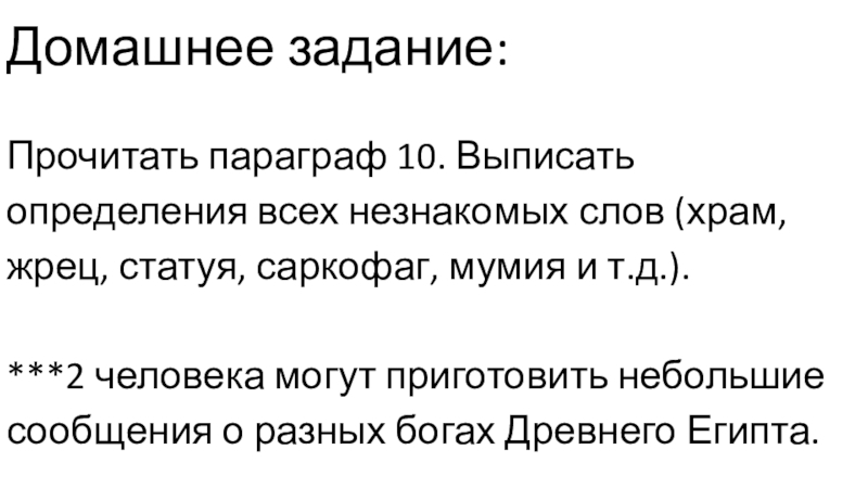Домашнее задание:Прочитать параграф 10. Выписать определения всех незнакомых слов (храм, жрец, статуя, саркофаг, мумия и т.д.). ***2