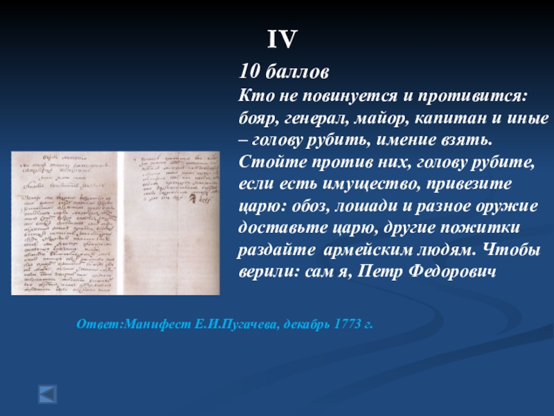 Ответ:Манифест Е.И.Пугачева, декабрь 1773 г.