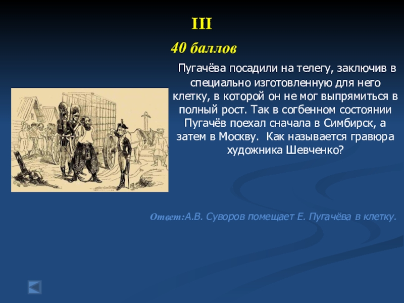 Ответ:А.В. Суворов помещает Е. Пугачёва в клетку.