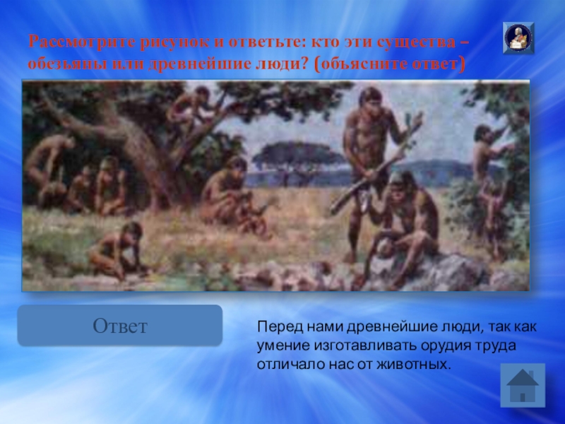 Перед нами древнейшие люди, так как умение изготавливать орудия труда отличало нас от животных.
