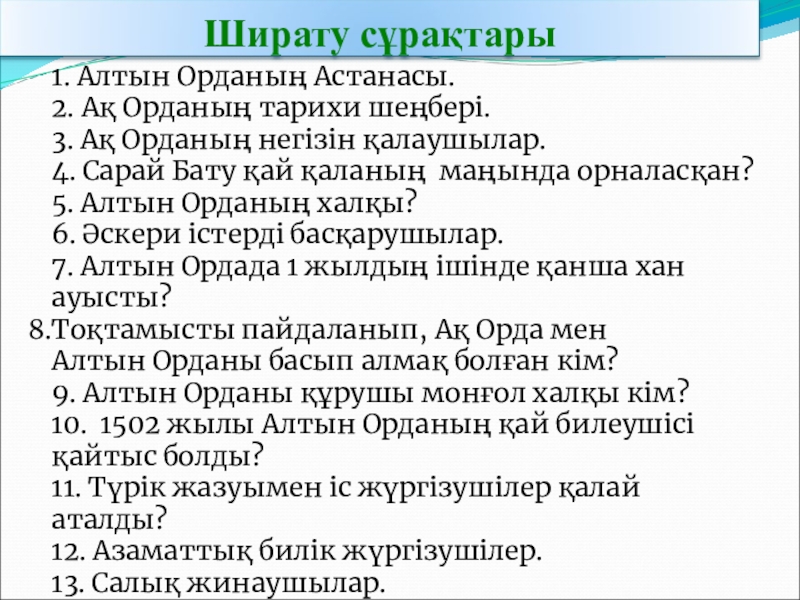 1. Алтын Орданың Астанасы.2. Ақ Орданың тарихи шеңбері.3. Ақ Орданың негізін қалаушылар.4. Сарай Бату қай қаланың маңында