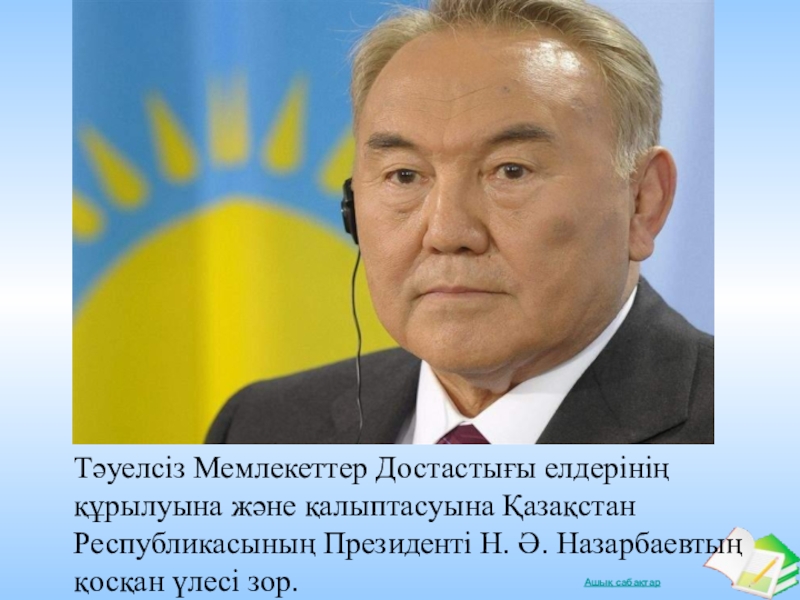 Слайд 35Тәуелсіз Мемлекеттер Достастығы елдерінің құрылуына және қалыптасуына Қазақстан Республикасының Президенті Н.