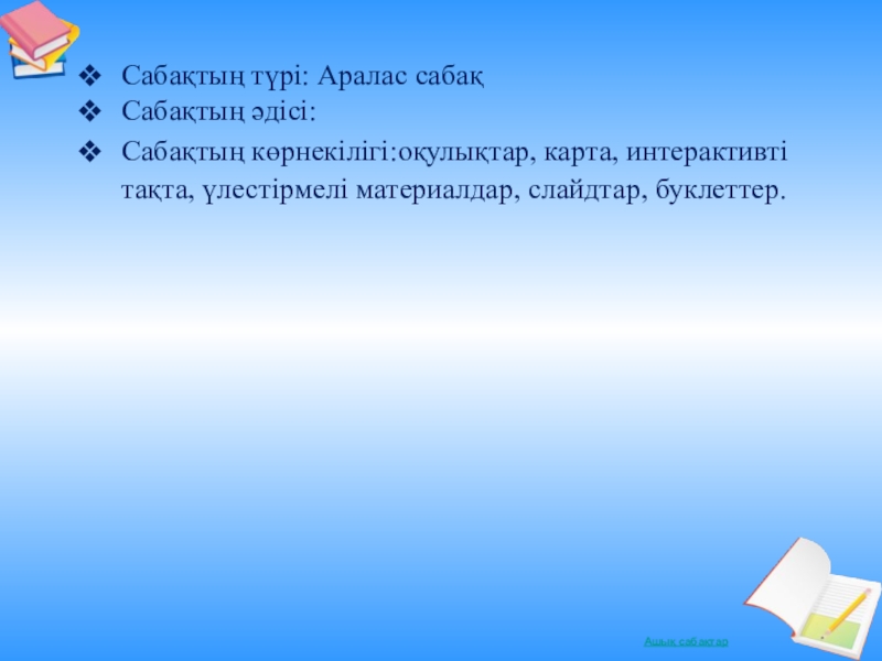 Сабақтың көрнекілігі:оқулықтар, карта, интерактивті тақта, үлестірмелі