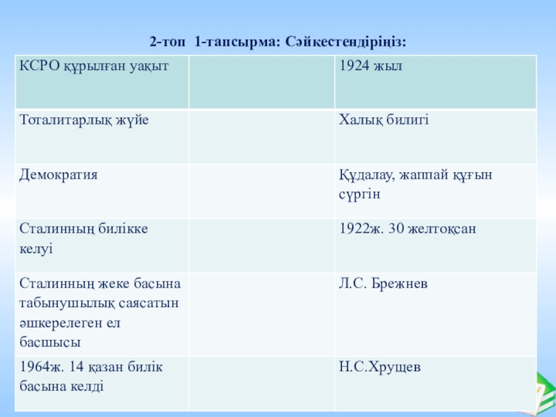 Слайд 392-топ 1-тапсырма: Сәйкестендіріңіз: