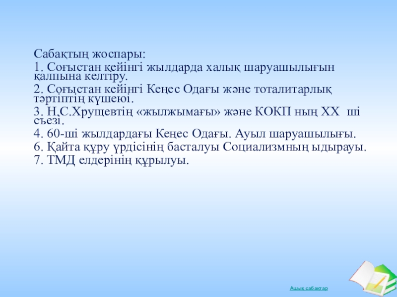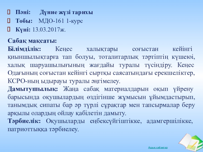Кеңес халықтары соғыстан кейінгі қиыншылықтарға тап болуы, тоталитарлық тәртіптің күшеюі, халық шаруашылығының жағдайы туралы түсіндіру. Кеңес Одағының соғыстан кейінгі сыртқы саясатындағы ерекшеліктер, КСРО-ның ыдырауы туралы әңгімелеу.