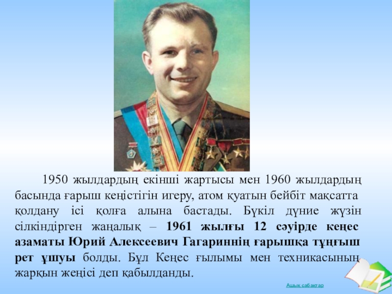 ғарыш кеңістігін игеру, атом қуатын бейбіт мақсатта қолдану ісі қолға алына бастады. Бүкіл дүние жүзін сілкіндірген жаңалық – 1961 жылғы 12 сәуірде кеңес азаматы Юрий Алексеевич Гагариннің ғарышқа тұңғыш рет ұшуы болды. Бұл Кеңес ғылымы мен техникасының жарқын жеңісі деп қабылданды.