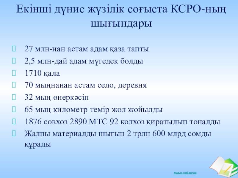 Слайд 15Екінші дүние жүзілік соғыста КСРО-ның шығындары
