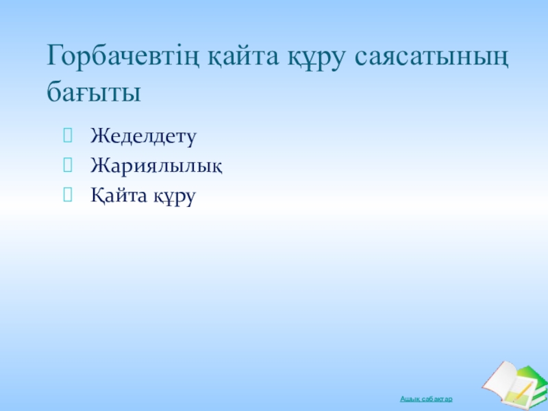 Слайд 30Горбачевтің қайта құру саясатының бағыты