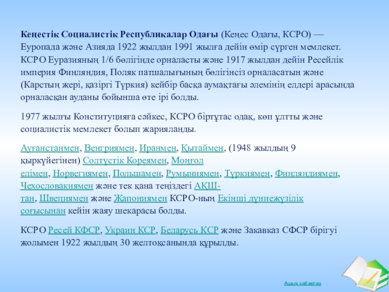 Слайд 12Кеңестік Социалистік Республикалар Одағы (Кеңес Одағы, КСРО) — Еуропада және Азияда 1922