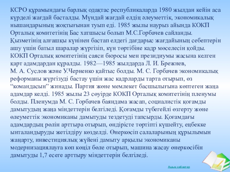 басталды. Мүндай жағдай елдің әлеуметтік, экономикалық нышандарының жоқтығынан туып еді. 1985 жылы наурыз айында КОКП Орталық комитетінің Бас хатшысы болып М.С.Горбачев сайланды. Қызметінің алғашқы күнінен бастап елдегі дағдарыс жағдайының себептерін ашу үшін батыл шаралар жүргізіп, күн төртібіне кадр мөселесін қойды. КОКП Орталық комитетінің саяси бюросы мен президиумы жасына келген қарт адамдардан құралды. 1982—1985 жылдарда Л. И. Брежнев,