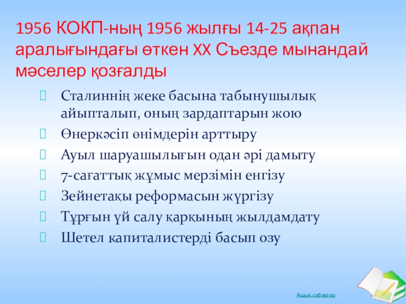 Слайд 231956 КОКП-ның 1956 жылғы 14-25 ақпан аралығындағы өткен XX Съезде мынандай