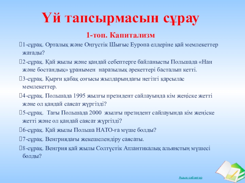 Слайд 5Үй тапсырмасын сұрау