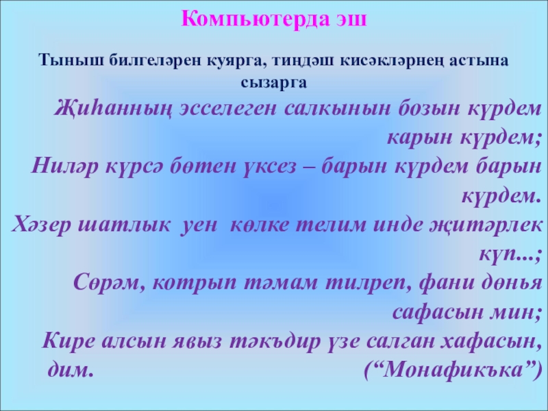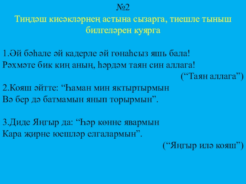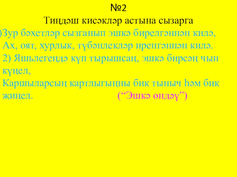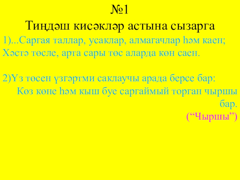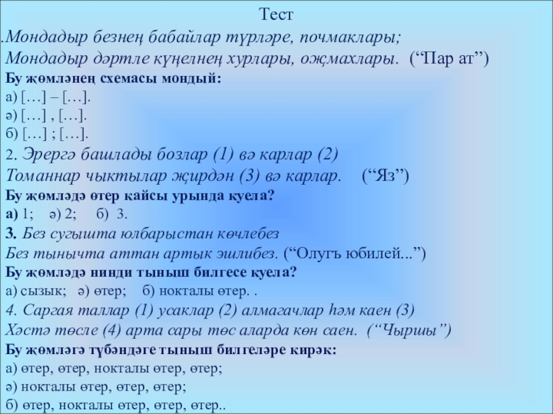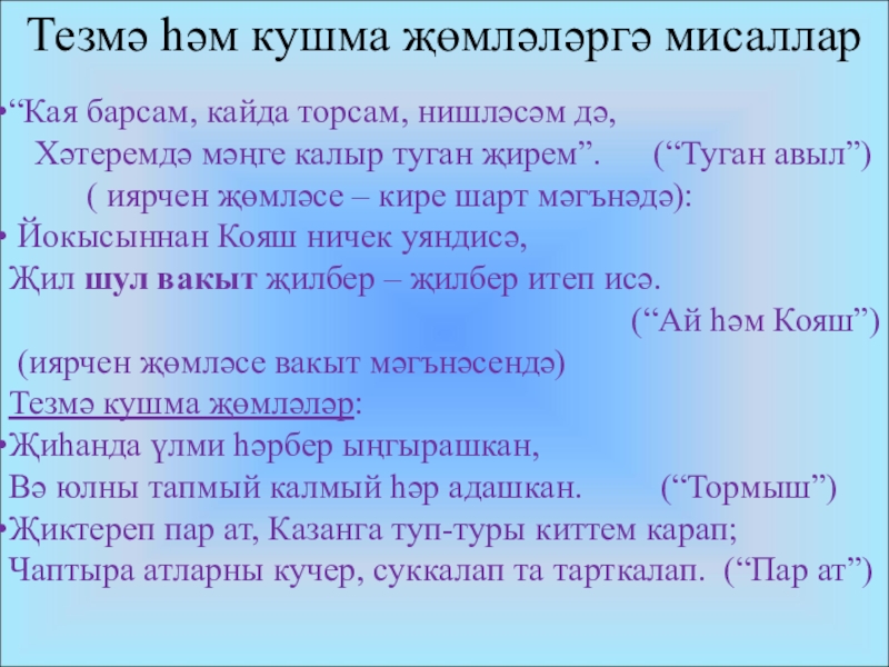 Слайд 13Тезмә һәм кушма җөмләләргә мисаллар