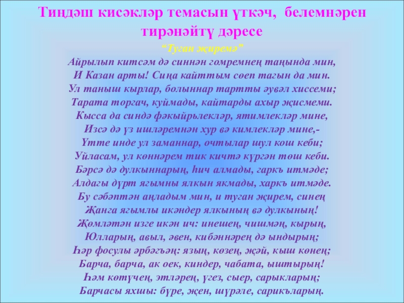 Җөмләтән изге икән ич: инешең, чишмәң, кырың,