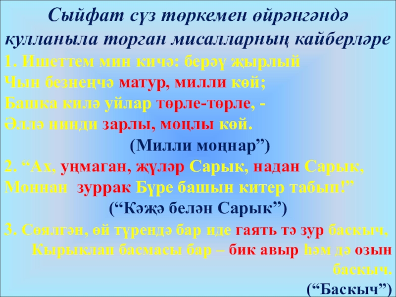 Слайд 3Сыйфат сүз төркемен өйрәнгәндә кулланыла торган мисалларның кайберләре