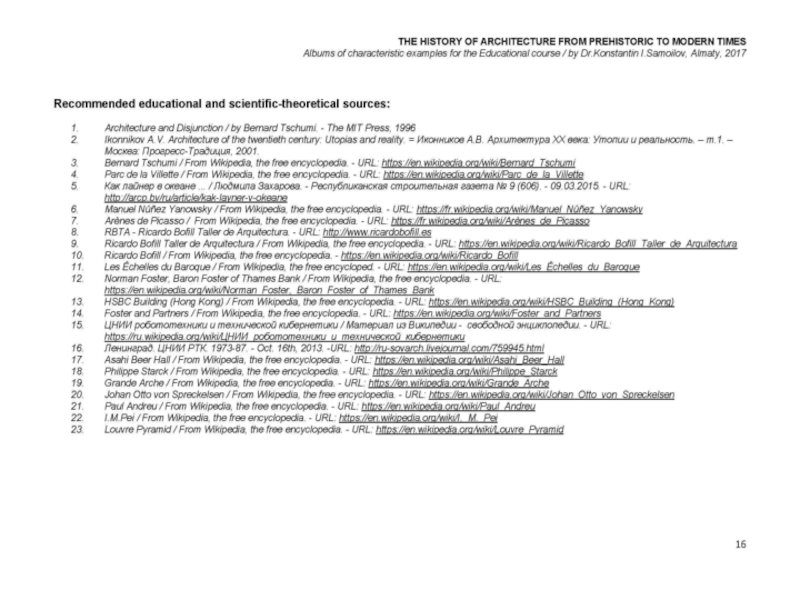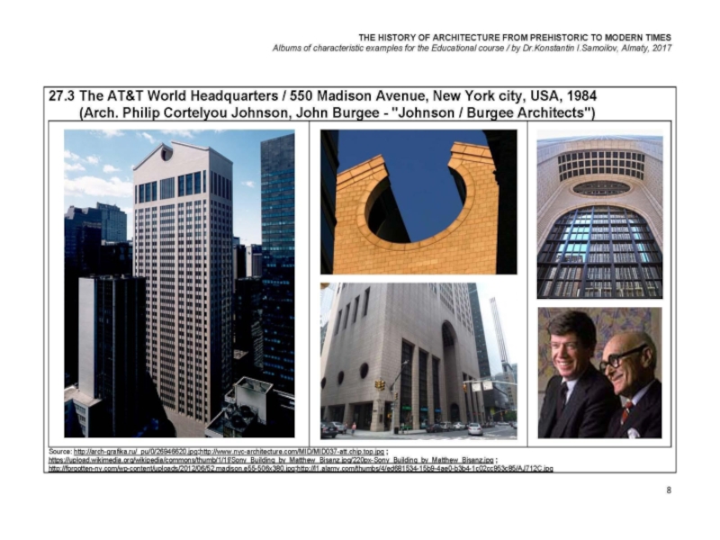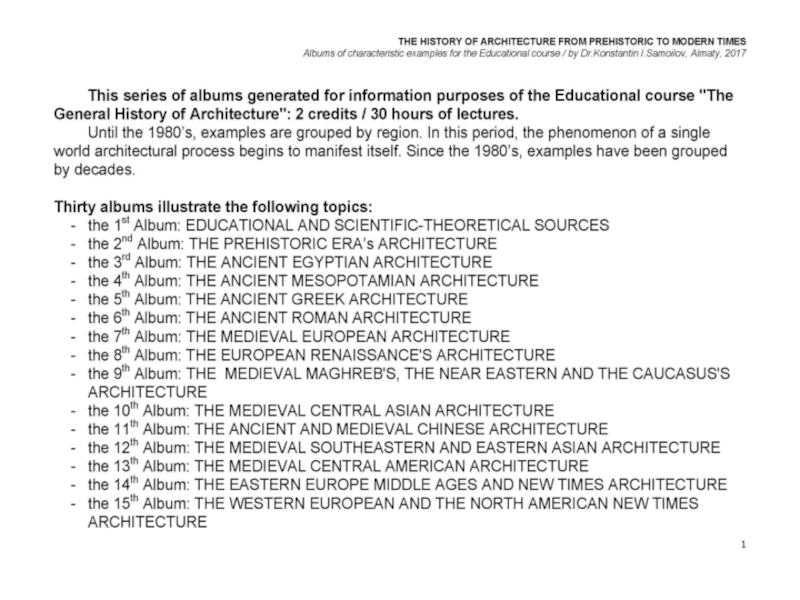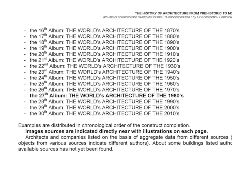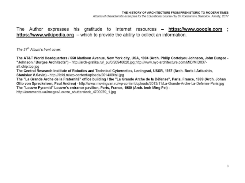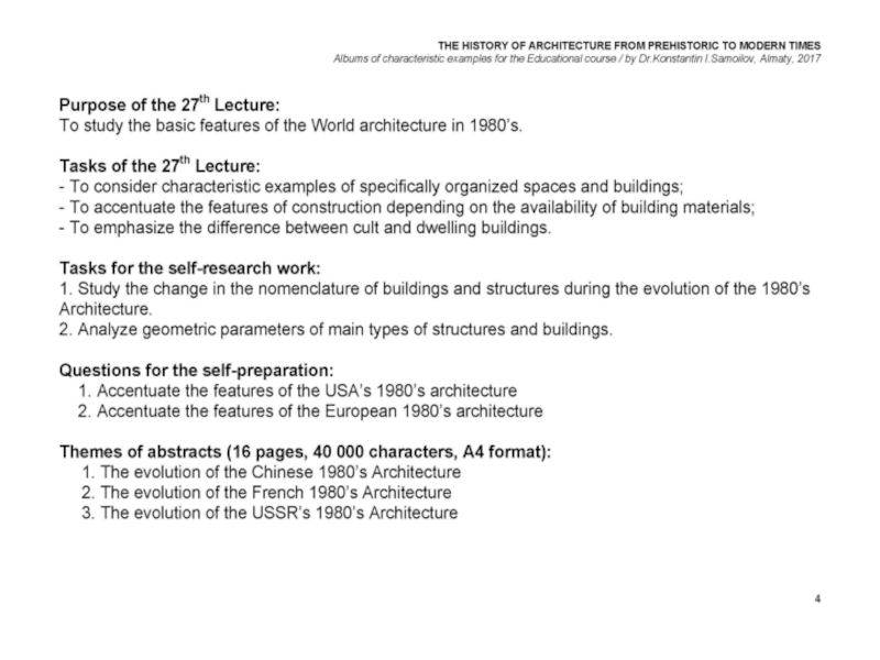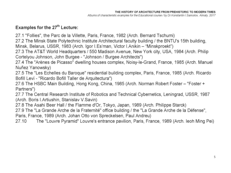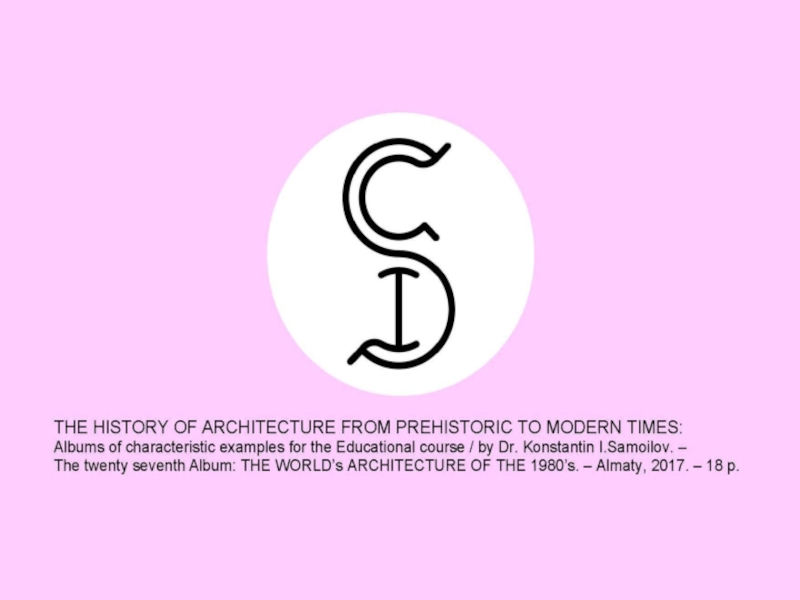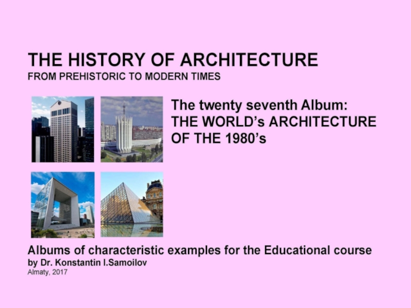 Презентация, доклад на тему THE WORLD’s ARCHITECTURE OF THE 1980’s / The history of Architecture from Prehistoric to Modern times: The Album-27 / by Dr. Konstantin I.Samoilov. – Almaty, 2017. – 18 p.