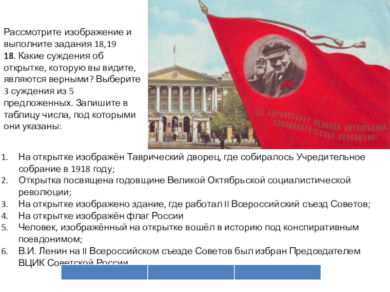 На открытке изображён Таврический дворец, где собиралось Учредительное собрание в 1918 году;