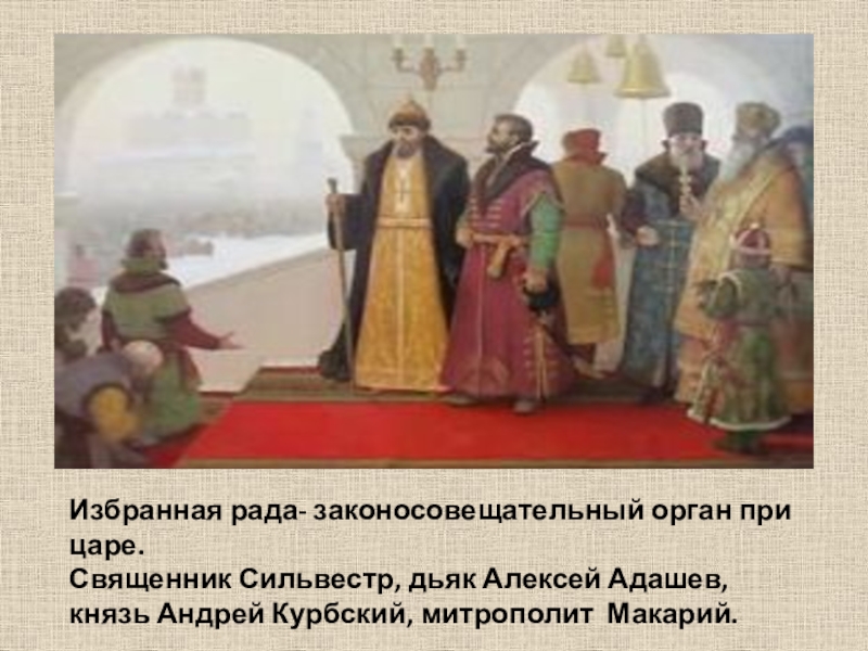 Избранная рада- законосовещательный орган при царе.Священник Сильвестр, дьяк Алексей Адашев, князь Андрей Курбский, митрополит Макарий.