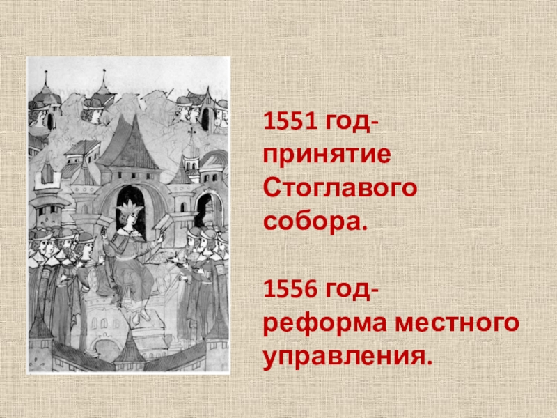 1551 год- принятие Стоглавого собора.1556 год- реформа местного управления.