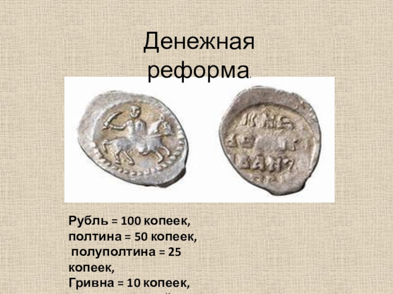 Денежная реформа.Рубль = 100 копеек, полтина = 50 копеек, полуполтина = 25 копеек,Гривна = 10 копеек, алтын