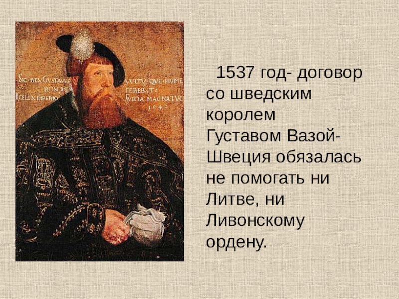 1537 год- договор со шведским королемГуставом Вазой- Швеция обязаласьне помогать ни Литве, ни Ливонскому ордену.