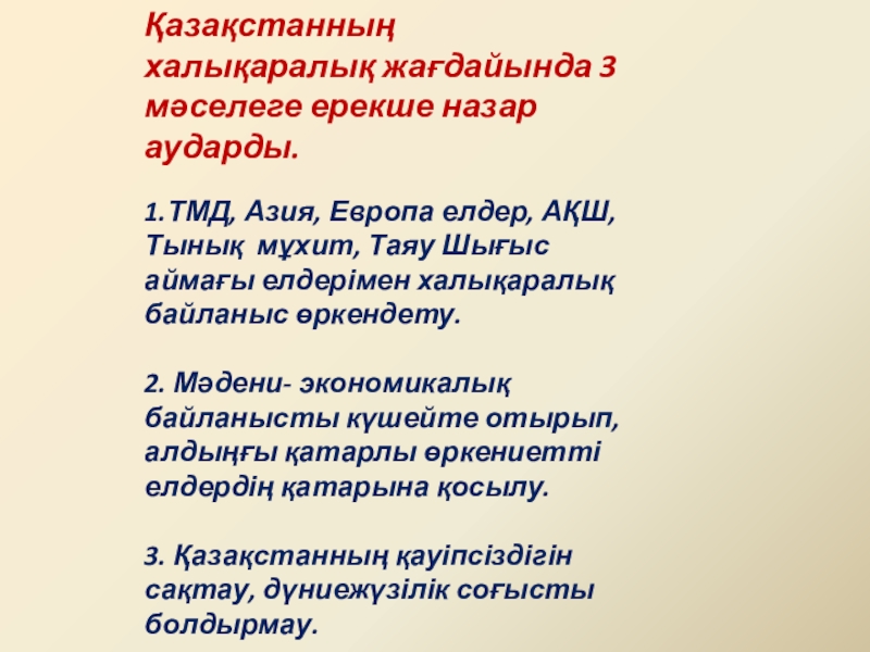 Слайд 6Қазақстанның халықаралық жағдайында 3 мәселеге ерекше назар аударды.